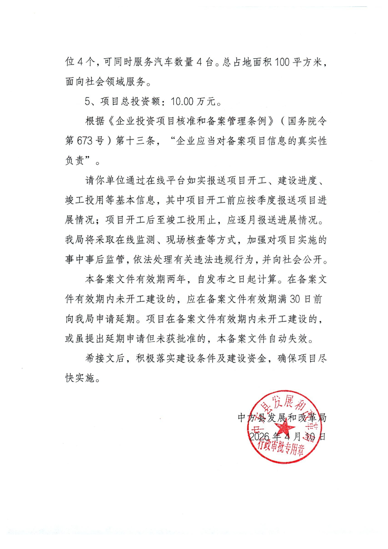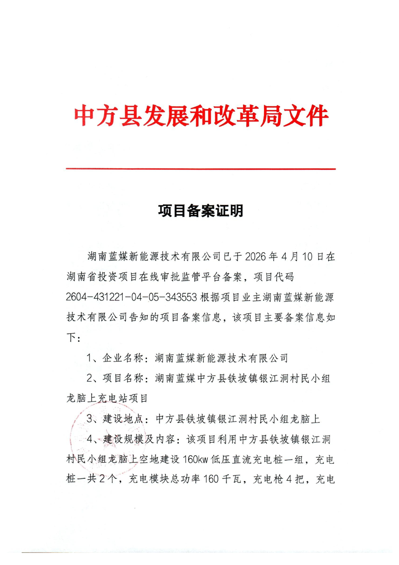 湖南蓝媒中方县铁坡镇银江洞村民小组龙脑上充电站项目备案证明