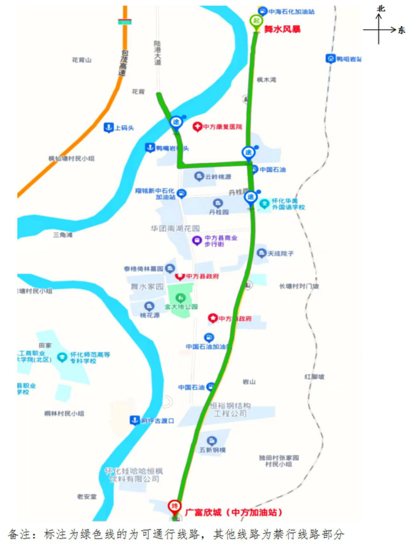一、国Ⅲ及以下排放标准的柴油货车(含外县籍)全天24小时禁止在隆平大道(原中方大道)[G209国道K2472+407—K2479+560,起点枫木湾舞水风暴—讫点怀化高新区与中方县交界中方加油站]以西县城所有城市道路(含县城河西,但隆平大道与陆港大道之间的香樟路除外)内通行,即由隆平大道经香樟西路前往怀化国际陆港经开区或由怀化国际陆港经开区经香樟西路前往隆平大道均不限时通行。